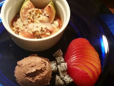 Tallerkenen er pyntet med plomme og kaktusfrukt i biter, samt en kule med Tofu sjokoladeis…En nydelig rett lørdag kveld, eller når regnet øser ned og når du har lyst på noe lunt etter måltidet, før du finner armkroken til din kjære.