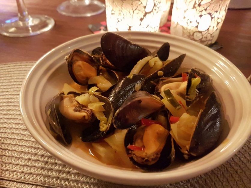 Som dere sikkert har skjønt elsker vi blåskjell! Og som kjærestekokken sa, nå er det sikkert mange som er lei fårikål og tunge kjøttretter. Det var vi, så vi sparte reinsdyret til en annen gang og kjøpte store, fine blåskjell fra Trønderlag. Skjellene er best nå utover vinteren, når vannet blir kaldere, så framover er det bare å meske seg med havets skatter. Blåskjell kan tilberedes på mange måter, og man kan få fram ulike smaker. Fenikkel er nydelig til all slags sjømat, og selv om den klassiske varianten av blåskjell sier persille og hvitvin, så er det ingenting i veien for å spice opp blåskjella litt. Red curry pasta, kan brukes til så mangt, inkludert blåskjell. Og når man koker grønnsaker, hvitløk, chili, sjalottløk i litt noilly prat (tørr vermut) og hvitvin, da får man virkelig fram smakene. Hvis man ønsker, så er det bare å jevne med litt fløte, for å få kraften litt mildere når skjellene er ferdig dampet. Deilig blir det i hvert fall – prøv selv og kjenn!