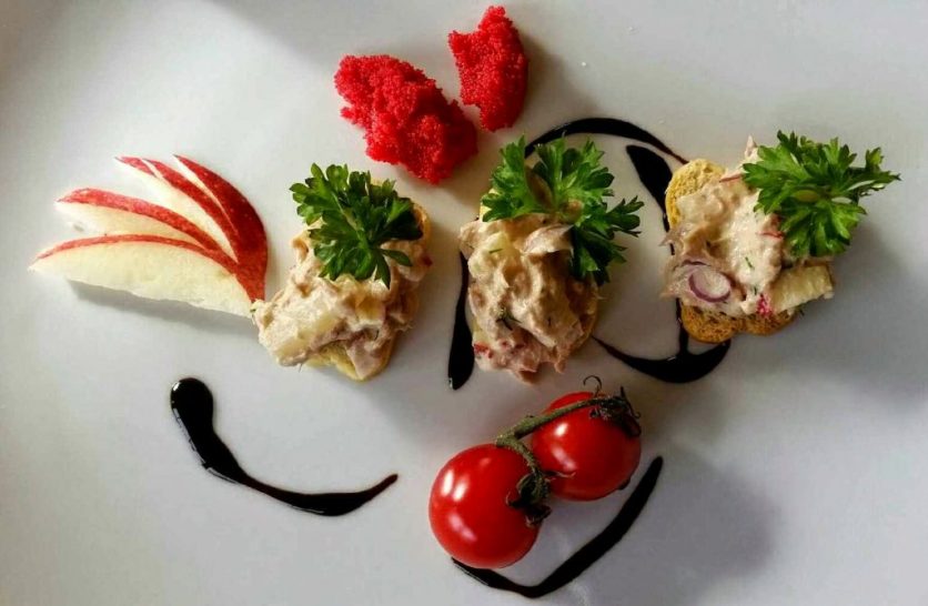 Nå er det fredag og tid for litt kjærestekos. En liten forrett, mellomrett, koserett, er det vi presenterer i dag. Denne retten kan brukes til alt fra pålegg på brødskiva, til en lekker forrett, sånn som den er presenter her på det lekre bildet til Svein. Dette er også fin mat å ta med på piknik. Og når retten blir dandert slik, er den jo virkelig en appetittvekker! En lekker presentasjon av en rett, vekker sansene. Det får oss til å glede oss over maten som blir servert, og all glede delt spres, slik at den mangfoldiggjøres. Så når dere lager mat til hverandre, tenkt litt på hvordan den blir presentert. Gjør det med kjærlighet! Kjærlighet som deles, får ringvirkninger langt utover det vi kanskje forventer. Via maten kan vi gi menneskene rundt oss glede og oppmerksomhet. Dessuten er det jo litt gøy å få maten til å se så delikat ut! Eller hva synes dere? Så bruk helgen til å dele glede via maten – det blir aldri feil 🙂