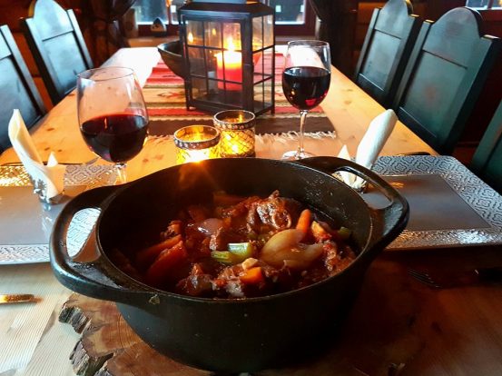 Høsten er tid for lammekjøtt, og for oss er dette topp mat som alltid smaker. Og vi elsker å prøve nye varianter av retter med lam. Og lam i gryte, skaper så utrolig herlige smaker sammen med løk, grønnsaker, tomat og ikke minst rødvin. Det er bare å glede seg til kveldens måltid etter flere timer på tur i fjellet, en nydelig høstdag. Kjærestekokken har forberedt det meste på forhånd før vi gikk på tur, så da er det bare å sette over gryta, og la den putre og kose seg utover ettermiddagen og kvelden, mens duften av tomater og lam sprer seg i hytta. Koldjomfrua skal bake Foccacia til retten, oppskriften finner dere på bloggen.